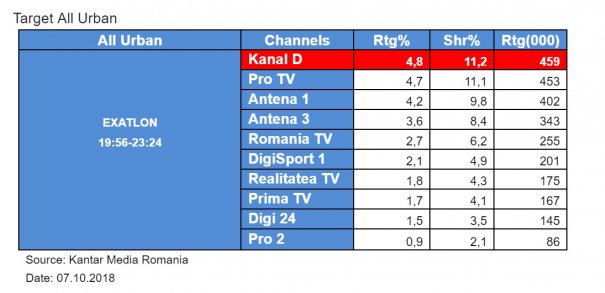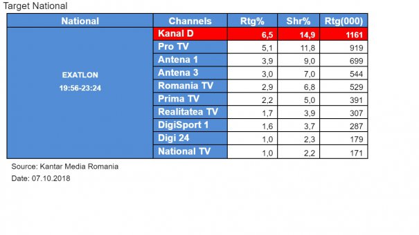 Aseara, in intervalul orar 19:56 – 23:24, Kanal D a inregistrat 6,5% rating si 14,9% cota de piata, pe targetul National, si 4,8% rating si 11,2% cota de piata, pe targetul All Urban. O medie de peste un milion (1.161.000) de telespectatori din intreaga tara au urmarit aseara Exatlon in fiecare minut al difuzarii. Minutul de maxima audienta, atins la 20:52, in momentul in care se difuza duelul intre Ciprian Silasi, de la Razboinici, si Cristian Geaman, de la Faimosi, a adunat in fata micilor ecrane 1.738.000 de romani.