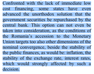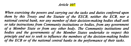 3. Nesurprinzător, cercetătorul post-doctoral Nicu Marcu plătit cu 4.000 de lei pe lună pentru asta (92.000 de lei în total), citează la mișto și chiar împotriva articolul 107 al tratatului. Pentru că articolul 107 vorbește despre independența Bancii Centrale Europene (ECB Nicule). Adică ECB și băncile centrale naționale nu vor căuta și nu vor accepta să primească instrucțiuni de la guverne (etc) și vor fi independente. Cu alte cuvinte, Nicu reinventează articolul 107 al Tratatului, forma originală fiind în mod evident neînțeleasă de Nicu.