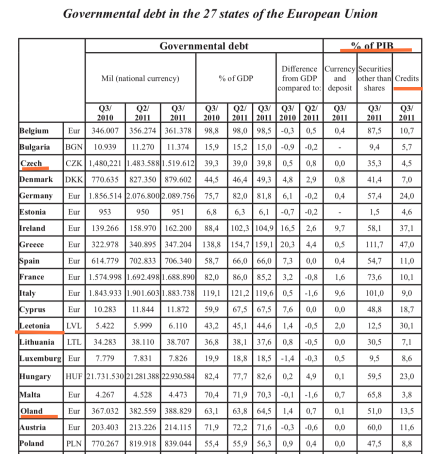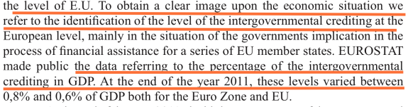 Comunicatul de presă Eurostat copiat se află aici, iar autorii cercetării încearcă să ascundă furtul punând ca sursă a tabelului și calcului Eurostat – Banca Centrală Europeană. În fapt, sursa este Eurostat, comunicatul de presă nr. 20/6 februrarie 2012, care nu se regăsește la bibliografie. - Aflăm în schimb că există țările ,,Oland”, ,,Czech” sau ,,Leetonia”, și desigur analfabetismul autorilor care în loc de împrumuturi (loans) folosesc termenul credits. Desigur, în limbajul academic al autorilor, în limba engleză, la produsul intern brut se spune? Cum altfel decât PIB, ca în română. Oricum ,,Oland” și ,,Leetonia” (în engleză Letonia este Latvia) sunt foarte tari pentru caracterizarea lui Nicu Marcu, prim autor. E ca și când ați studia o cercetare științifică despre Abibas, Mike, sau Powasonic (în loc de Adidas, Nike sau Panasonic).