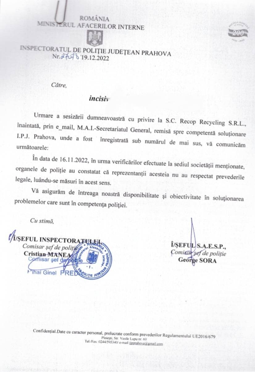 Si MINISTERUL AFACERILOR INTERNE a confirmat, inca o data, prin adresa nr 27078/19.12.2022, ca reprezentantii Recop Recycling SRL Pleasa au incalcat LEGEA!