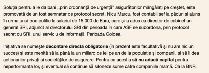 E suficient să citiți titlurile (dacă nu aveți câteva ore pentru a citi întreaga investigație, pe care am făcut-o în sute de ore de analiză, de muncă de documentare și investigație, din 2021 până în 2023, pe baza înțelegerii exacte a cum funcționează atât piața asigurărilor cât și, mai bine decât oricine din presă, mecanismul de luare a deciziilor în ASF sau de neluare a deciziilor din ASF (am fost purtător de cuvânt al ASF, pentru o scurtă perioadă, până în Decembrie 2014), dezvaluie anal;istul economic Radu Teodor Soviani.
